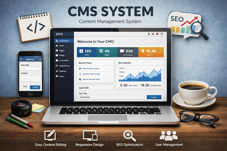 A Content Management System (CMS) is software that allows you to create, manage, and modify digital content—like website pages, blog posts, and images—without needing to write code from scratch. It acts as a user-friendly interface that handles the technical “heavy lifting” in the background, such as database management and server interactions.